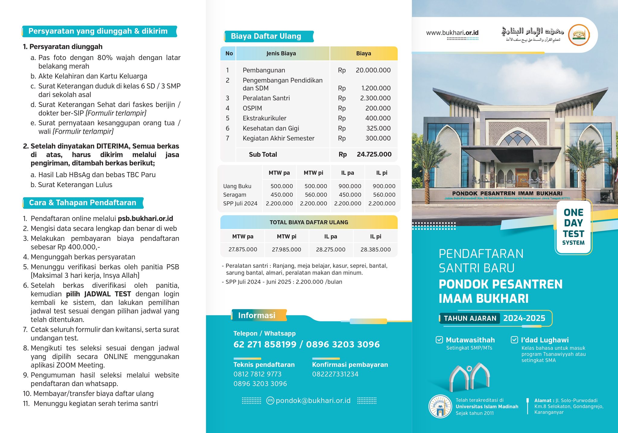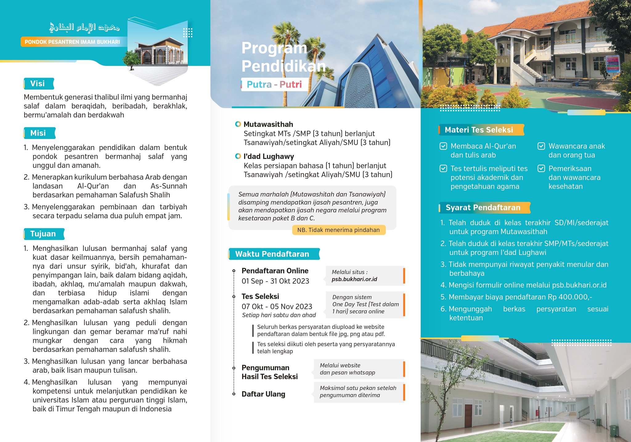 - Pendaftaran dilakukan secara online melalui website pesantren psb.bukhari.or.id